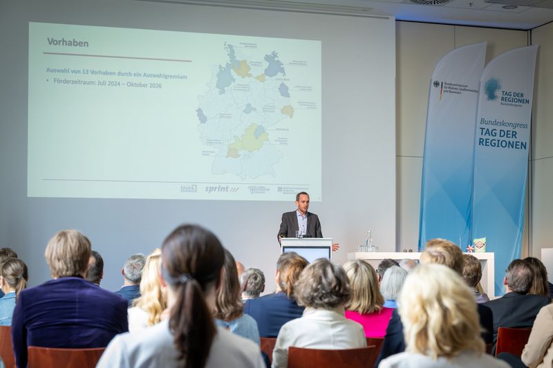 In der eigenen Fachveranstaltung „Strategische Impulse für regionale Entwicklung: Herausforderungen begegnen, Zukunft sichern“, moderiert von Lutke Blecken von Institut Raum & Energie und Dr. Anika Noack von SPRINT, stellten wir dem Staatssekretär im BMWSB Dr. Olaf Joachim und einem interessierten Publikum zwei zentrale Projekte der strategischen Regionalentwicklung vor und diskutierten diese mit beteiligten Regionen auf dem Podium sowie den Zuhörer:innen: